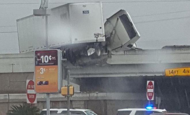 Thankfully, no one was hurt in the accident. The truck nudged the edge of the wall while navigating traffic during heavy rains and it caused the front end of the trailer to slid over the edge. The front part of the 18-wheeler wedged up against the wall but didn’t put the driver in harm’s way.
