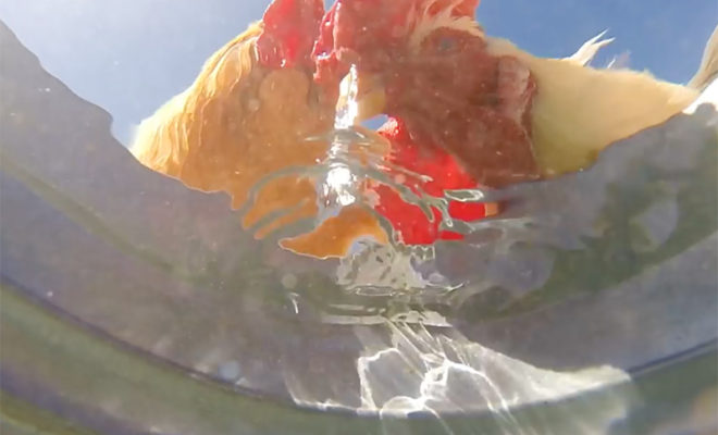 A video titled “the bucket” doesn’t sound like it would be particularly captivating, but this clip, recorded on May 5th is a wonderful combination of relaxing and beautiful. A man placed a camera at the bottom of a water bucket and filmed as animals came up to take a drink. Creatures of all sizes gather at the small watering hole including bees, birds, a rabbit, and a donkey. Seeing the animals from a completely different perspective and noticing how they take sips of water is rather interesting, as well. Chickens seem to nip at the water while the donkey sucks up the water like he’s drinking out of a straw.