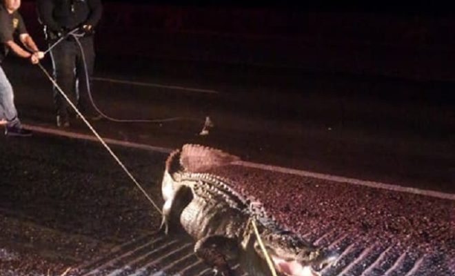 Measuring 11.5 feet in length, a massive alligator that was clipped by a transport truck caused a traffic shut-down on U.S. Highway 59 in southeast Texas on Monday, April 30. That’s when authorities received some assistance from a local cowboy after they put the call out for a wildlife wrangler.