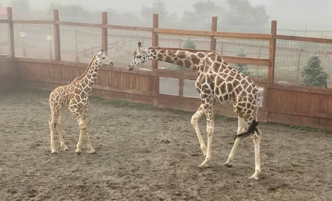 Recently, the young male giraffe was able to meet his father, Oliver. On September 18, the Animal Adventure Park posted a three-minute long video (seen here) that chronicles the first meeting of all three giraffes on a foggy day. “April, Oliver and Tajiri all interacted very well together and we are so excited to share this with you!” park officials wrote. During the interaction, it’s clear that Oliver was checking to see if April was ready to mate again. The park posted that they waited until the end of her cycle to make sure that wouldn’t interfere with the first introductions.