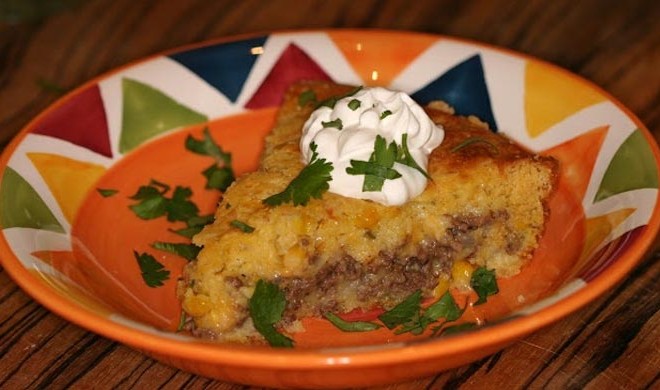 Pour ½ of corn batter into greased 13X9 pan. Sprinkle grated cheese onto layer of corn batter. Crumble ground beef over cheese. Sprinkle chopped jalapenos and onions over beef. Pour remaining corn batter over top and bake at 350 degrees F for 40-45 minutes.