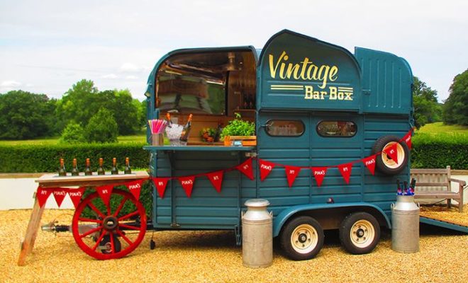 There are a number of features you often want to see at a special event, such as a “station” for things like wine and cheese (seen above) or mimosa bars, a picture booth, or simply a great backdrop for party photos. As part of the full event complement you can offer, a re-purposed horse trailer can make the difference, often remembered by your guests as a memorable component of the party.