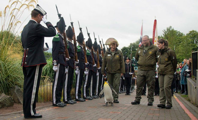 Sir Nils Olav is given a new rank every few years to celebrate the Zoo’s mascot and bond between two countries. The Edinburgh Zoo’s website quotes Barbara Smith, Acting Chief Executive Officer for the Royal Zoological Society of Scotland, as saying, “We are honoured to host His Majesty the King of Norway’s Guard as they bestow a prestigious new title upon our king penguin, Sir Nils Olav. It is a very proud moment and represents the close collaboration between our two countries, Scotland and Norway.”