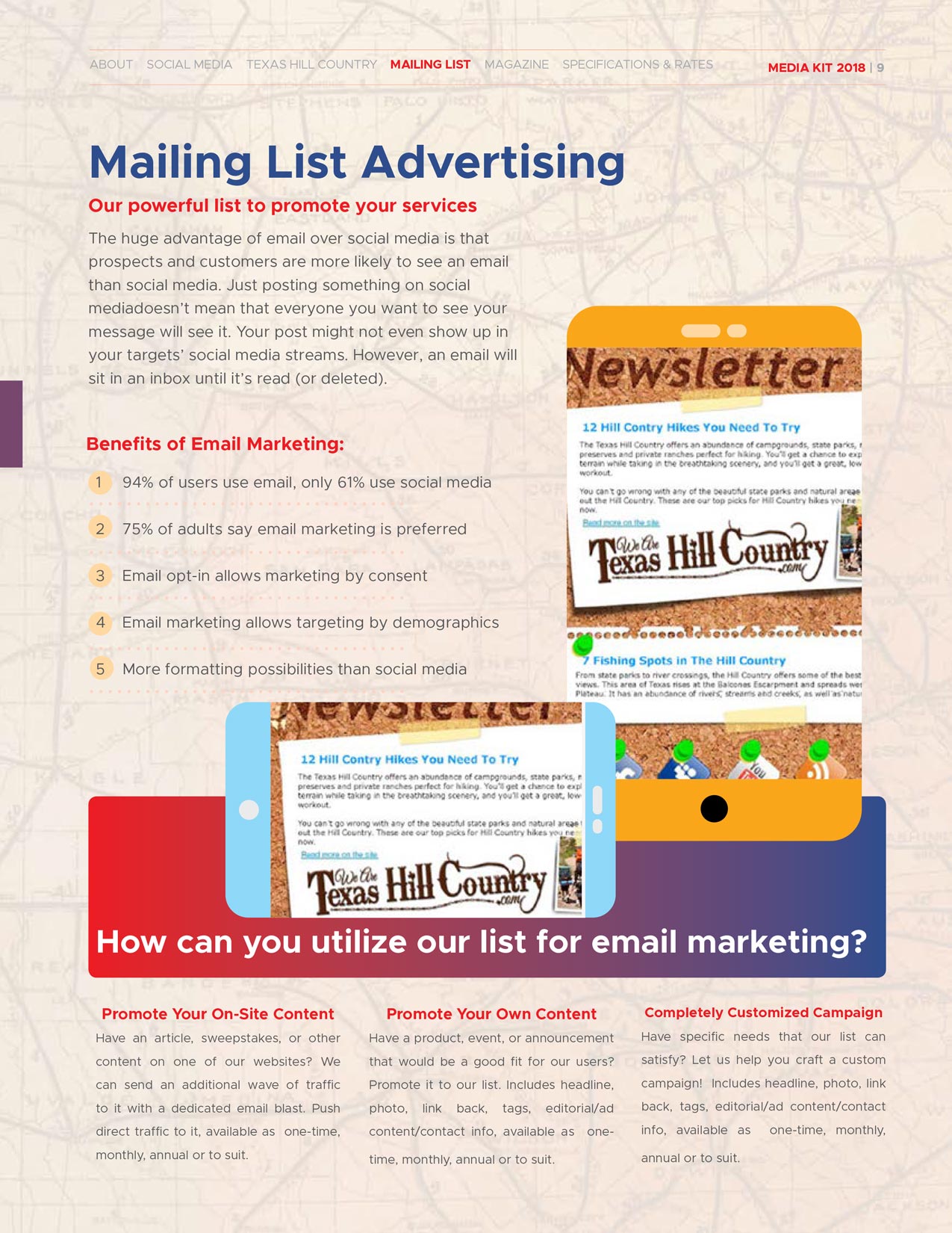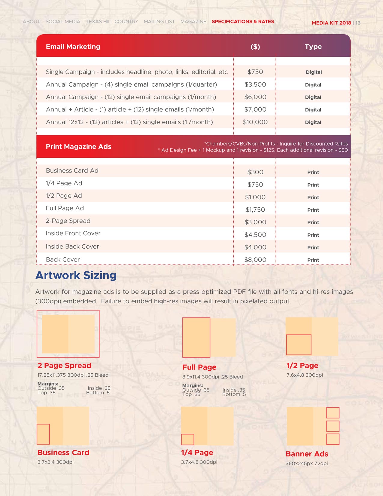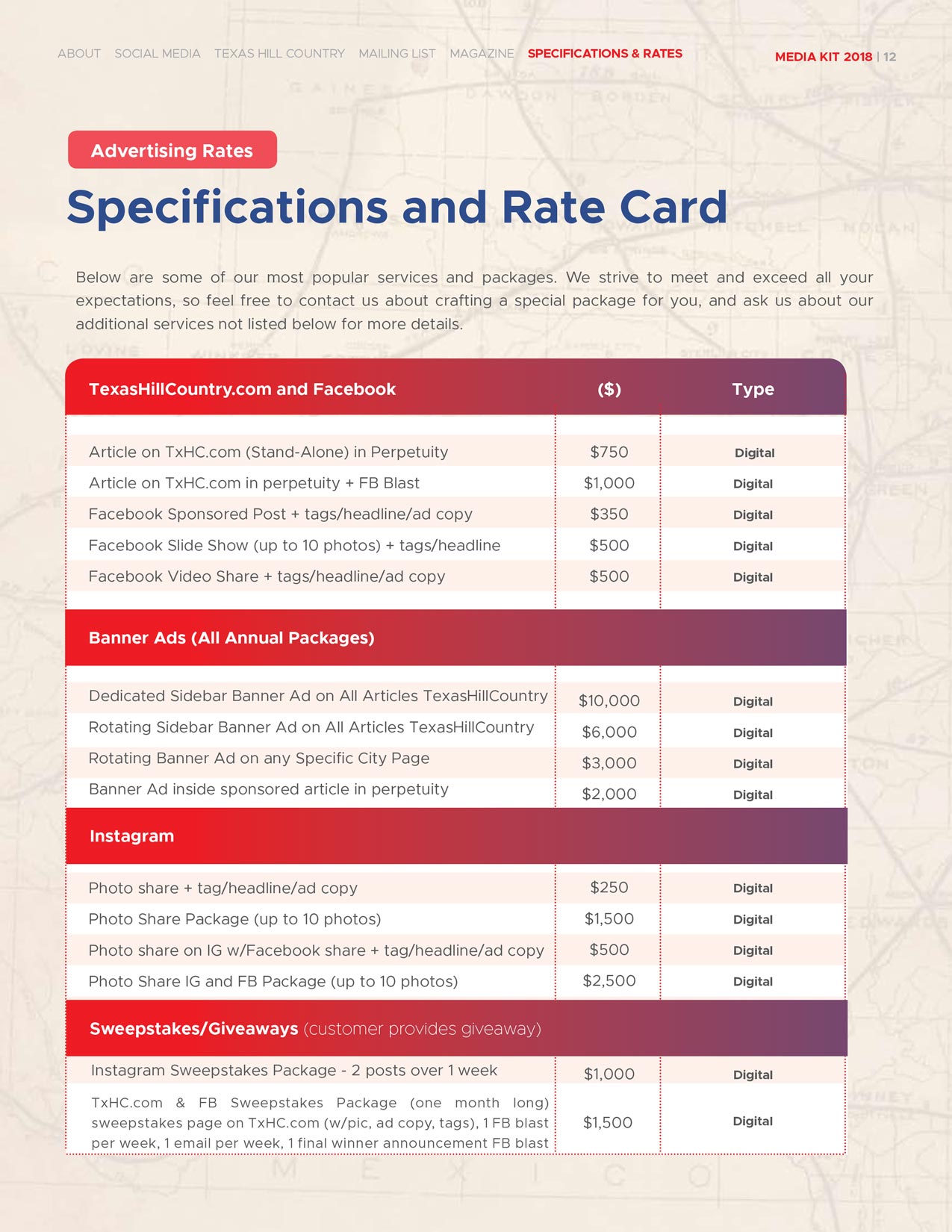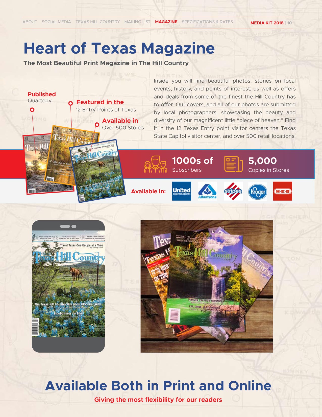 Here at Texas Hill Country, we offer a variety of services for businesses, cities, CVBs and brands, no matter the size. Through our internet based ads, our Heart of Magazine, and our unique marketing platform, we have a place and price that is right for you.