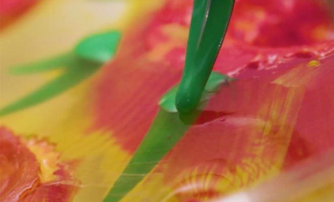 In a new, soothing video by Super Deluxe, viewers are treated to a view of the pretty process of making floral gelatin cakes. First, clear gelatin is poured into a dome-shaped mold, then a portion of the middle of the gelatinous form is scooped out to make way for an inner design. Accessing the dome through the newly made hole, the cake artist can insert special tools to deposit color for the leaves and petals of beautiful flowers.