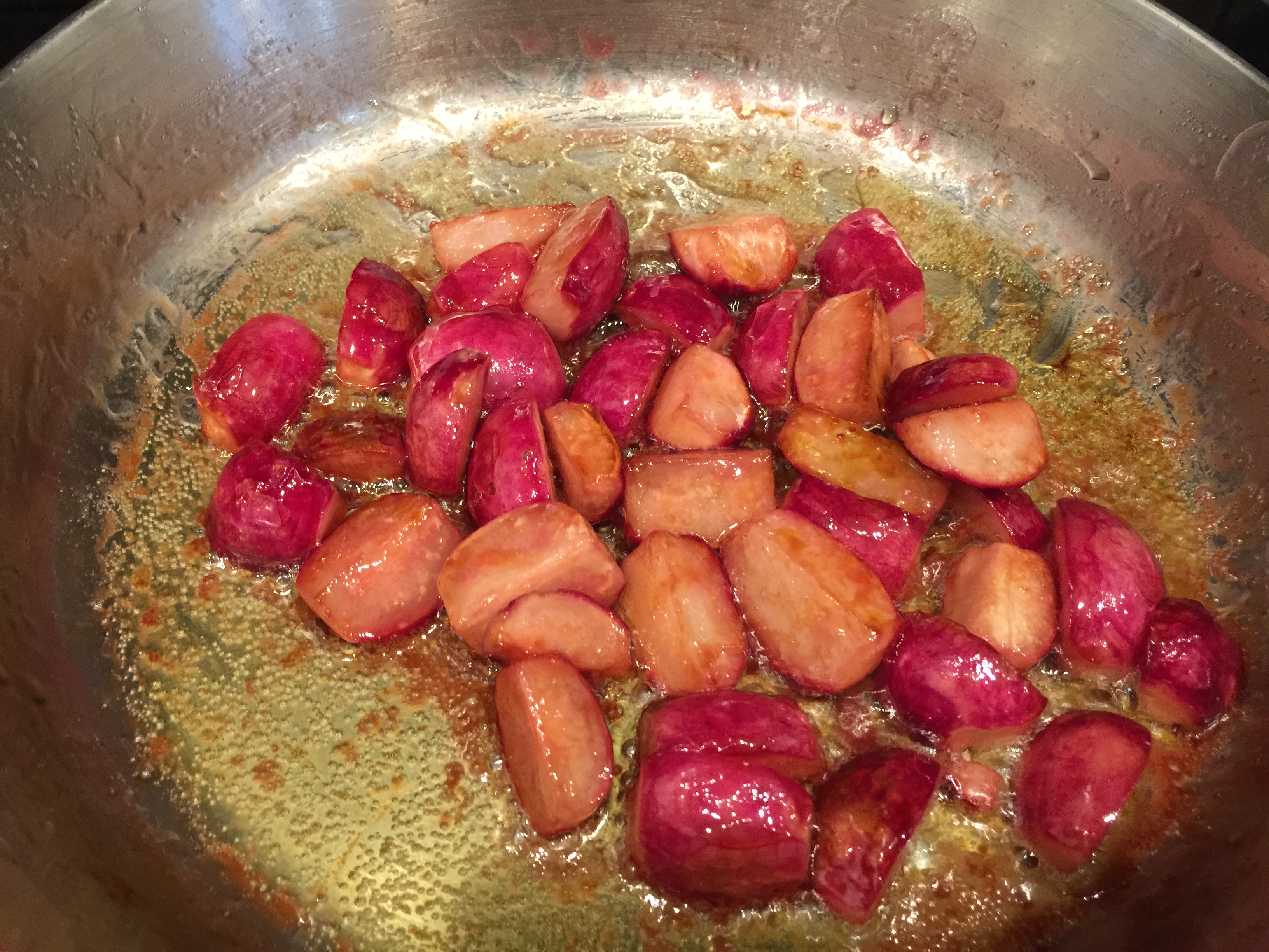 Sauté for about 15 minutes over low to medium heat or until radishes are tender, slightly browned, and become somewhat translucent.