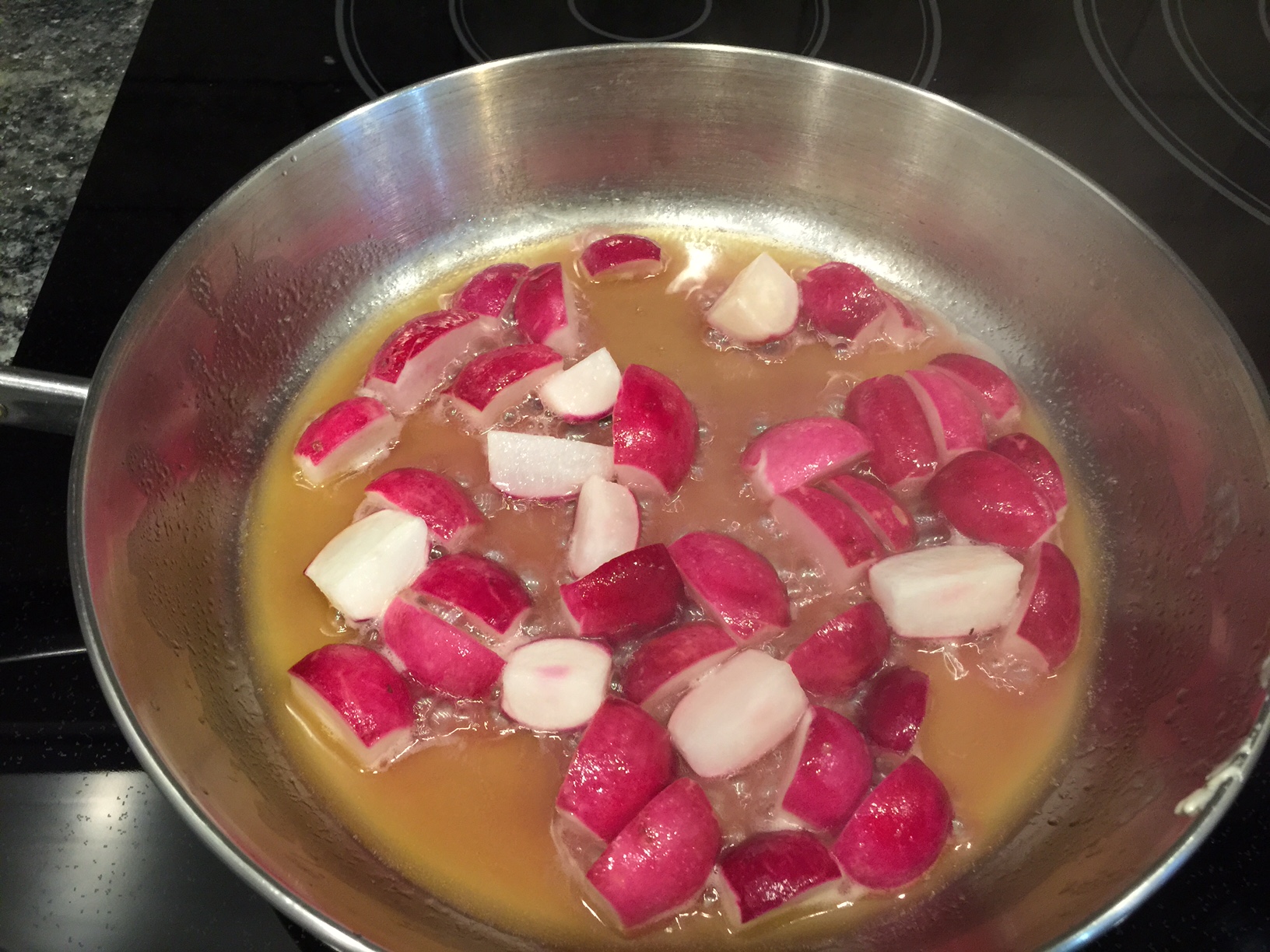 Melt the butter and honey in a saucepan or skillet. Add the quartered radishes and salt.