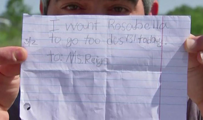 Rosabella Dahu, a second-grader, decided she wanted to go home early from school so she wrote a note. The staff member believed it.