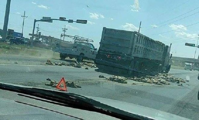 There’s been no cause for the spill identified as of yet, however the last of the cleanup was completed by 6 p.m., and the semi was then able to haul the remainder of its shipment to another location. Slaton Hwy. is a major thoroughfare through the city of Lubbock, Texas. Although a spill of this nature wouldn’t require the presence of a HazMat team, you can bet the onlookers behind it, and in the vicinity, may have required the use of some creative breathing (in through the mouth, out through the nose…) in order to make their way through.
