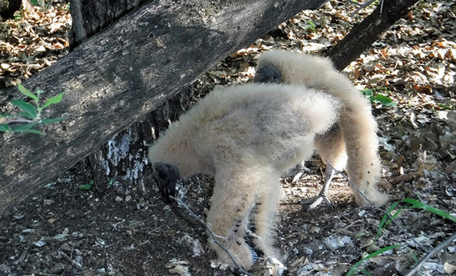 According to MySA.com, officials think the young birds are specifically black vultures. AllAboutBirds.org says that these creatures will soon trade their fluffy looks for “sooty black plumage, a bare black head, and neat white stars under the wingtips” once they’re fully grown. Black vultures are known to maintain a strong familial bond throughout their lives. Their lives begin with 1 – 3 eggs in a clutch followed by 38 days of incubation and up to eight months of feeding from their mother after birth. They stay in the nest for a period of around 80 days. The adult birds will often follow Turkey Vultures to find food since their sense of smell isn’t as fine tuned.