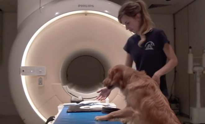 In order to test the theory that dog brains can understand language and recognize how words are said with the rising and falling of the voice (intonation), researchers found some very accommodating dogs that could calmly lay in an MRI machine while they watched their brain patterns react to trainers talking to them.