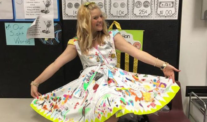 Teacher Wears Stunning Dress Made of Her Students’ Artwork