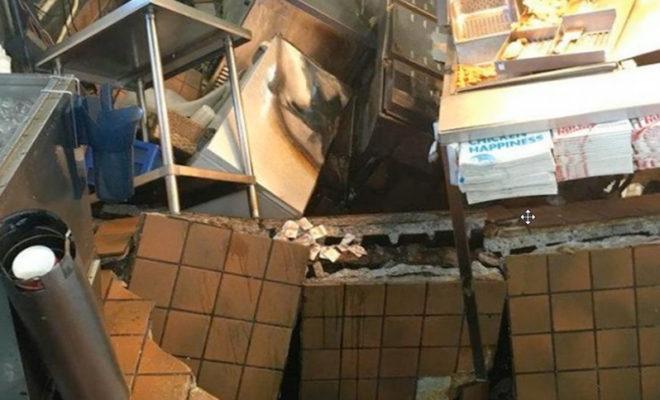 One of the employees was trapped in a crevice formed by the broken flooring. A customer jumped over the counter to help her as her skin was burning from the grease.