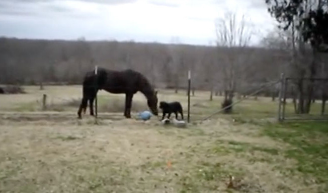 YouTuber countrynow1 posted this video of their land in Texas where one horse and one pup are the best of friends. Whiskey Brown, the stallion, and Lucy, the Portuguese Water Dog, were raised together and have grown to be two very amusing playmates.