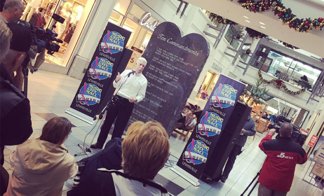 Music City Mall, formally known as Vista Ridge Mall, in Lewisville, Texas (north of Dallas) has a new attraction meant to stop shoppers in their tracks. NBC DFW reports that the Friday after Christmas, an “…eight-foot-tall stone tablet engraved with the Ten Commandments,” was unveiled.