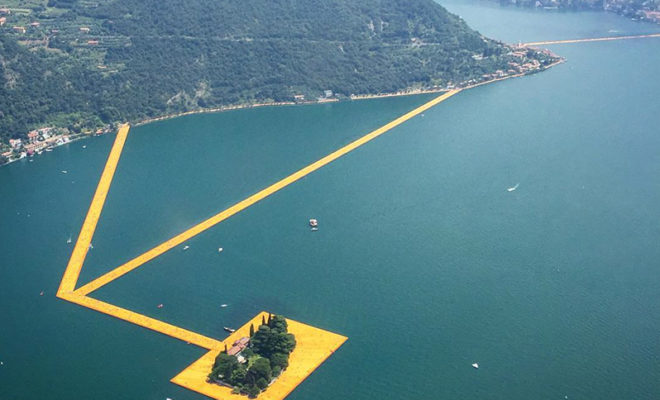 From June 18 to July 3, 2016, an unbelievably beautiful art installation floated in Lake Iseo in Italy. The $17 million project was dreamt up by artists Christo and Jeanne-Claude. You may remember their famous installation in Central Park called “The Gates.” Jeanne-Claude has since passed away, but Christo made sure another one of their visions came to life. The new stunning piece is called “The Floating Piers.”