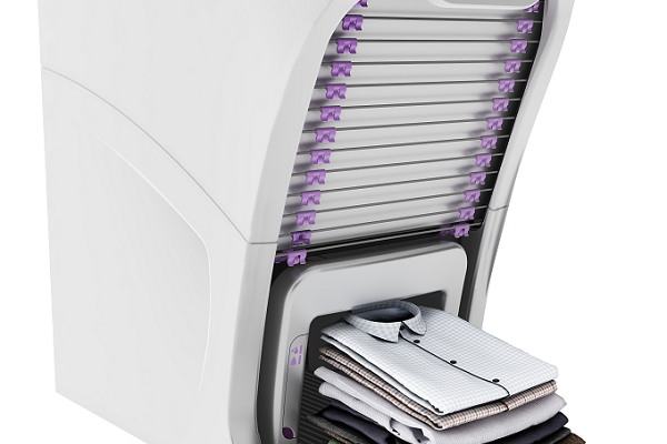 The process begins when you use the easy clipping technology to feed the clothes into the machine, 15 to 20 items depending on clothing size. Once inside the robot will commence to fold your clothes. De-Wrinkling and treatment capsules that can sanitize and perfume your clothes as well will be an option and sold separately.