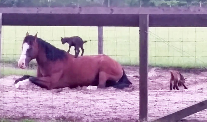 What do you do when you need a kid sitter around the farm? Put your horse out to pasture and let the little goats have a fun day romping around!