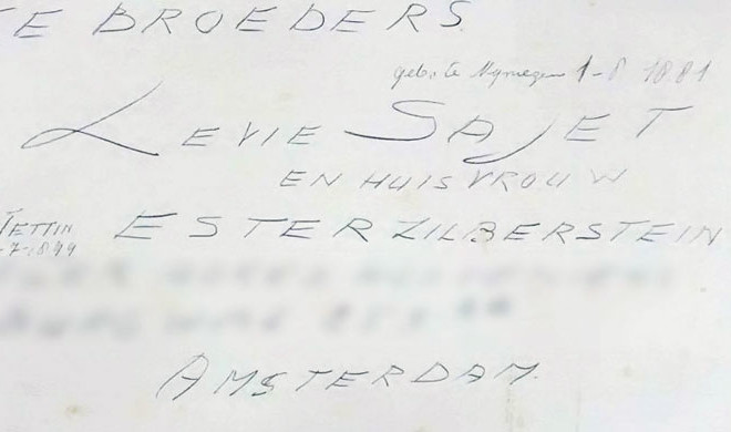 The message, written in Dutch, is translated as follows: “Look on the roof and find my last personal things and try after the war to find family of ours. Give them my things and you will become something. Oh God of Israel, have mercy on your humiliated brothers. Signed Levie Sajet born at 1-8-1881 born in Nijmegen and his housewife Ester Zilberstain born at Stettin on the 28-7-1899.”