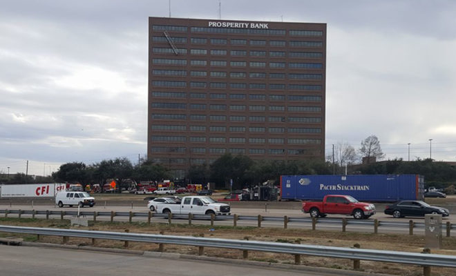 On Wednesday afternoon, two men cleaning windows on the tall Prosperity Bank building in North Dallas near the LBJ Freeway were suddenly left dangling 15 stories in the air when one side of the scaffolding became loose and plummeted downward. Though one side of the scaffolding still tightly held, the two men were left swinging on their safety equipment alongside the platform and were in need of rescue.